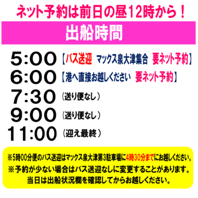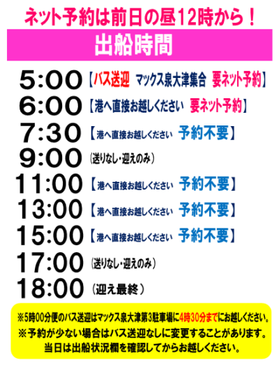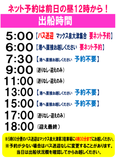 ※出船時間の15分前には受付を済ませ船の前でお待ちください。(時間厳守)