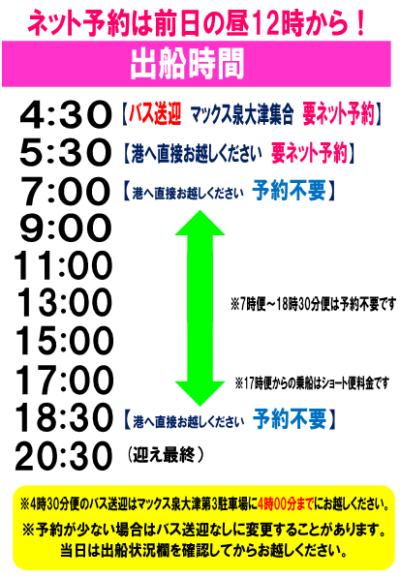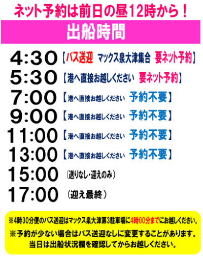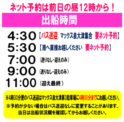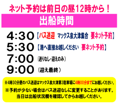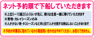※前日昼12時からのネット予約受付します。1番船の予約をとった方は3時頃ここをもう一度確認してからお越しください。