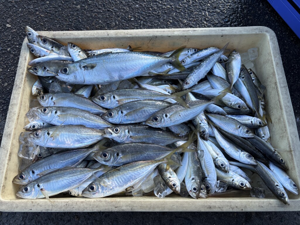 旧一文字赤灯 先端内向き 足元サビキで小〜中アジ!暗い時間は小アジとサバが多め、明るくなってから中アジが増えたようです。