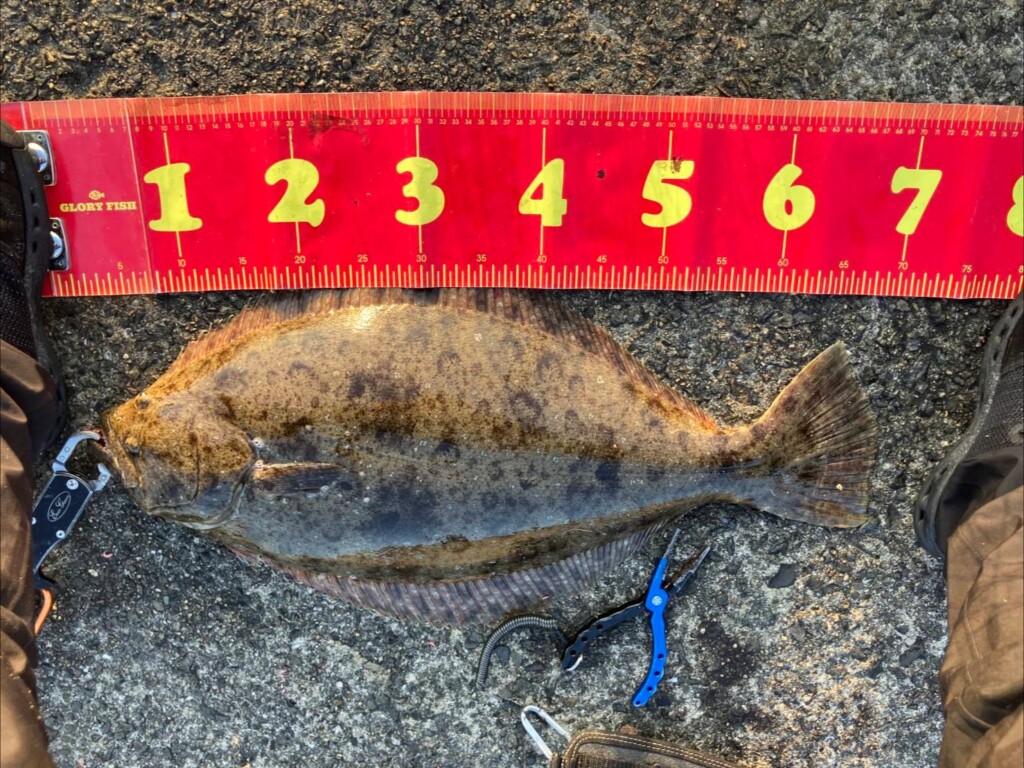 神倉様 沖の北内向き 胴突飲ませで良型ヒラメ!7時半頃にヒット!