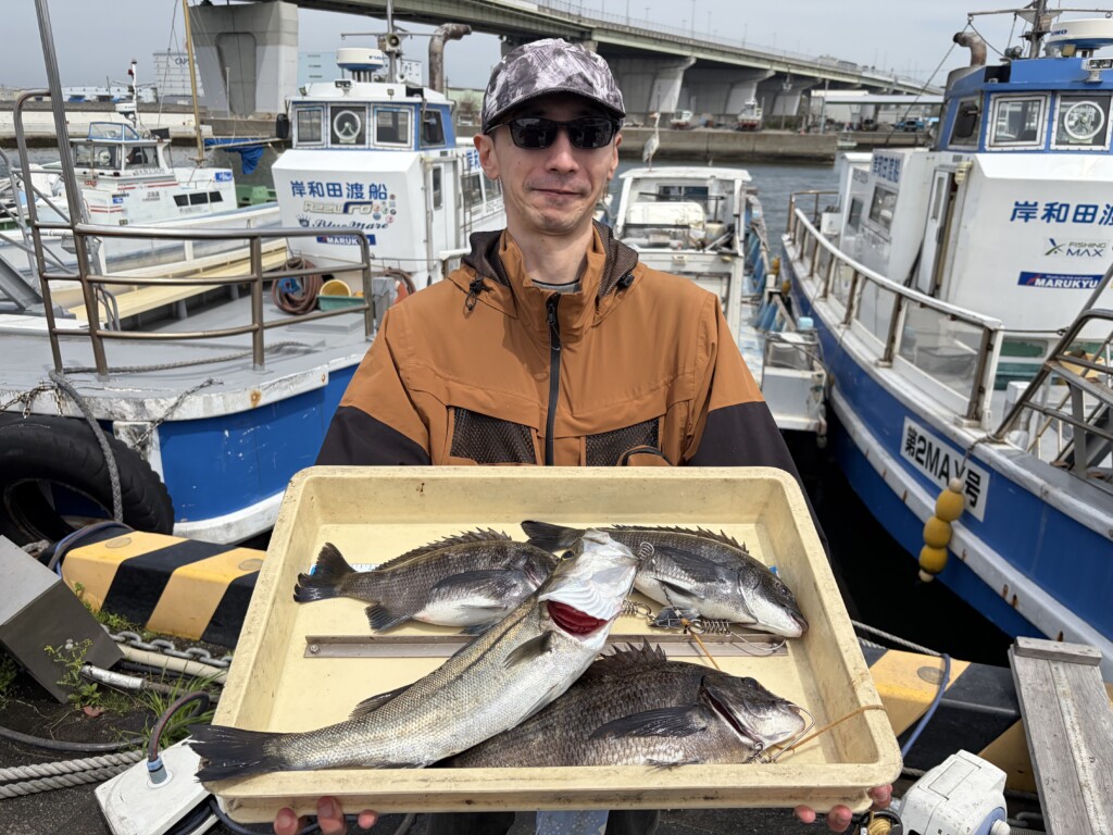 川原様 旧一文字白灯 エビ撒き ハネ56.5cmまでを2匹とチヌ🎣8時頃に時合♪